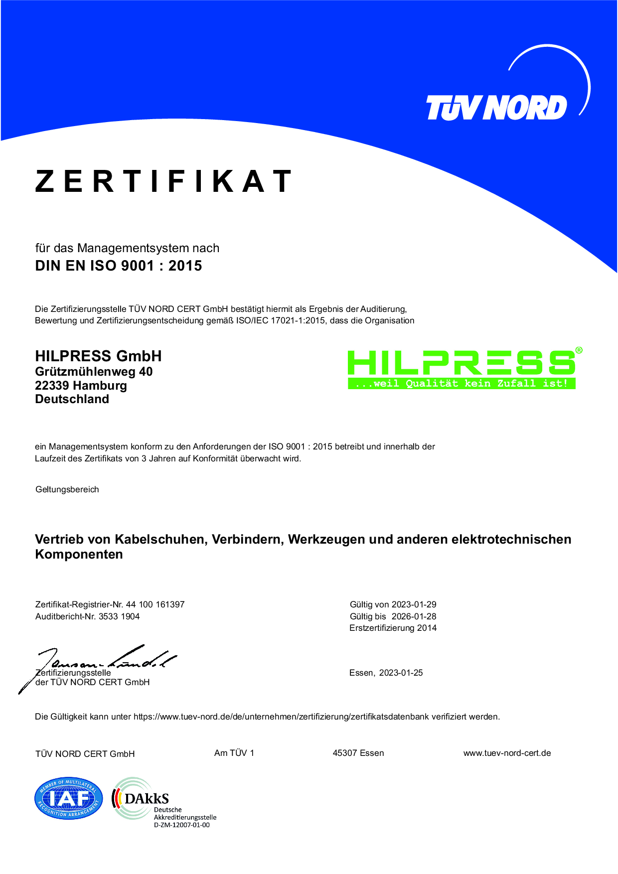 Im Jahr 1994 erhält die Hilpress GmbH die Zertifizierung nach DIN ISO 9001. Dabei ist es eines der ersten Unternehmen der Branche, welches diese Zertifizierung erhält. Der Standard DIN ISO 9001 bringt eine ständige Anwendungsverpflichtung mit sich, welche die gesamte Belegschaft mit einbezieht. Gleichzeitig ist es aber auch eine wesentliche Bedingung, um über ein geprüftes Managementsystem mit optimierten Prozessabläufen ein Vertrauensverhältnis zum Kunden zu schaffen.